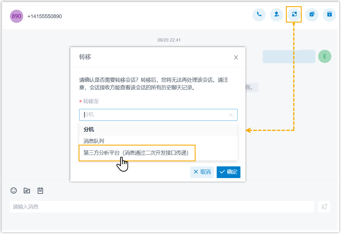 - 分机用户可直接将其消息会话转移至第三方消息分析平台。注: 对于 Linkus 手机端,支持此功能的版本为 5.19.7 或更高。