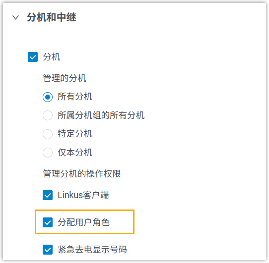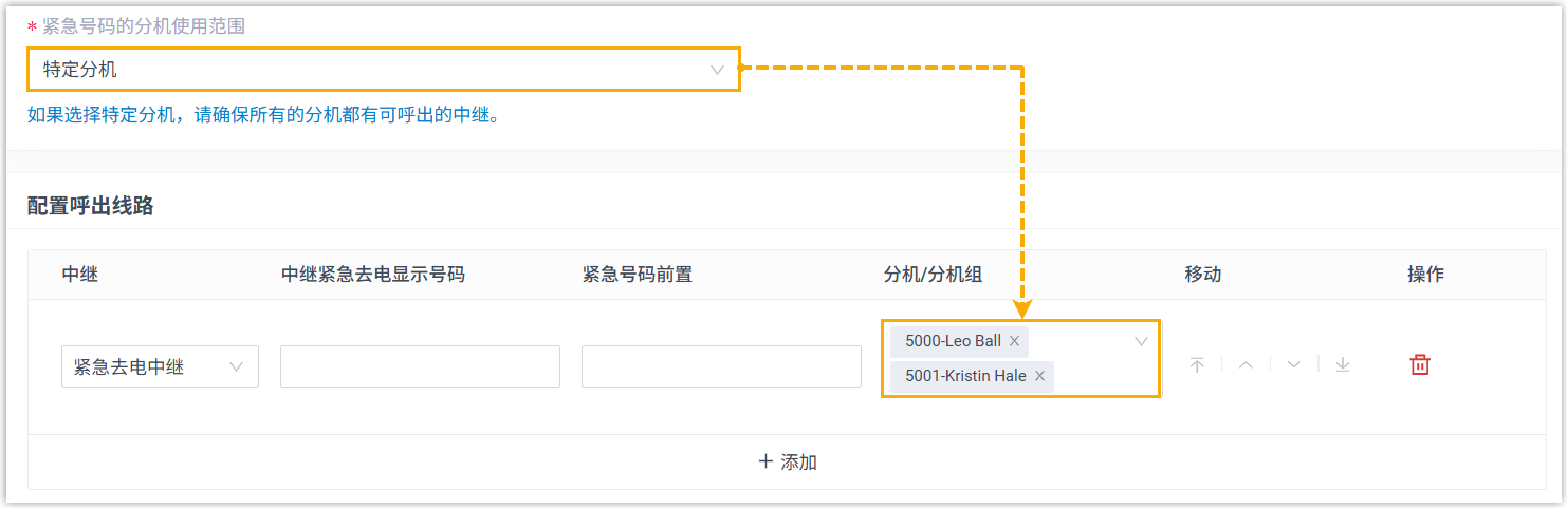 - 支持指定允许呼叫紧急号码的分机 (路径:)。注: 需确保选中的分机具有使用 配置呼出线路 中指定中继呼出的权限。