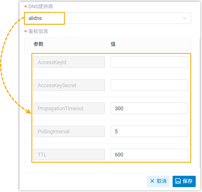- 优化证书的 DNS 提供商鉴权设置 (路径:):选择 DNS 提供商后,界面自动显示所需鉴权字段,你可以直接填写鉴权凭据,而无需手动搜索和添加鉴权字段。