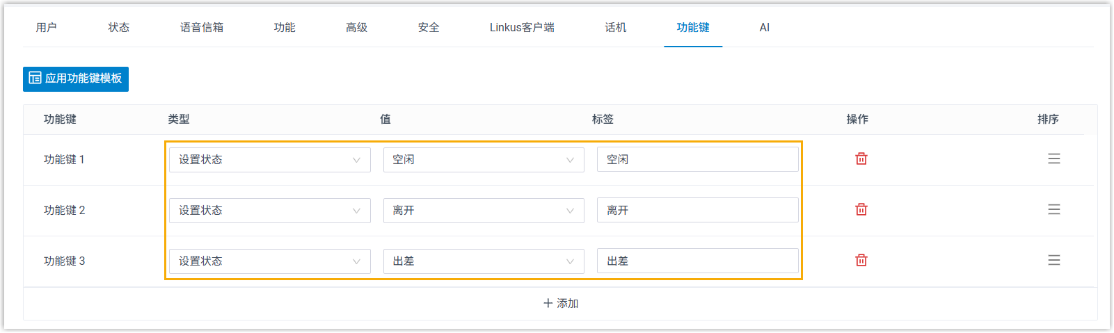 设置状态,允许分机用户通过功能键快速切换至指定分机状态。