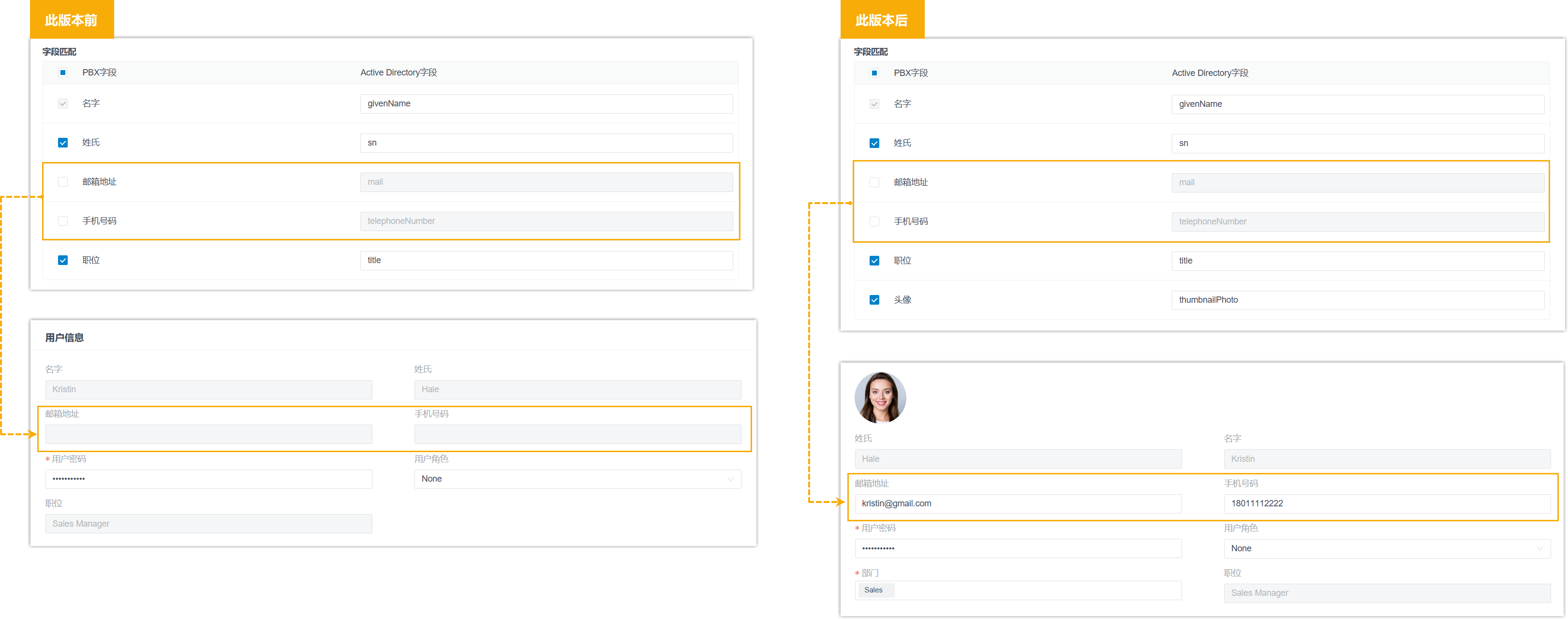 若禁用了特定字段的映射,则相应信息不会被同步,你可以直接在 PBX 上编辑该用户的信息。