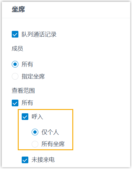 优化队列坐席权限设置:细化对已接通话记录查看范围的控制,分为以下两个选项 (路径:。