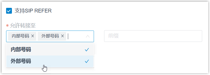 - 对于外部号码,PBX 在转接通话时会在 REFER 请求的目标号码前添加配置的前缀。