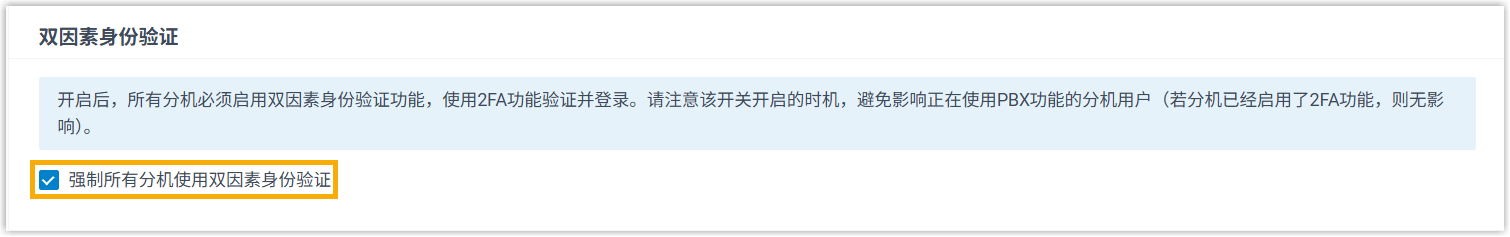 你可以强制所有分机使用双因素身份验证,确保他们在登录账号时必须同时提供账号密码和验证码。