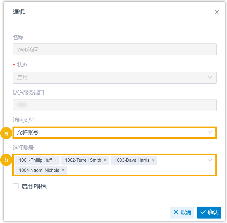 - 禁止账号:仅选中的分机账号被禁止远程访问,其余账号仍可通过 FQDN 远程访问 Linkus 网页端。