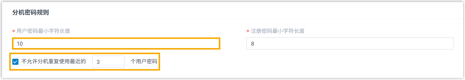 栏,设置用户密码最小字符长度,并禁止重复使用最近使用过的密码。