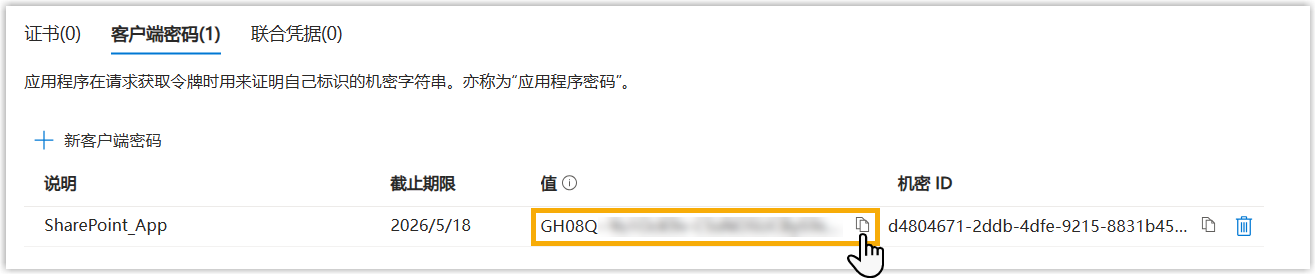 - 在 Microsoft Entra 应用程序的左侧导航栏,进入 证书和密码 > 客户端密码,接着点击 新客户端密码。
