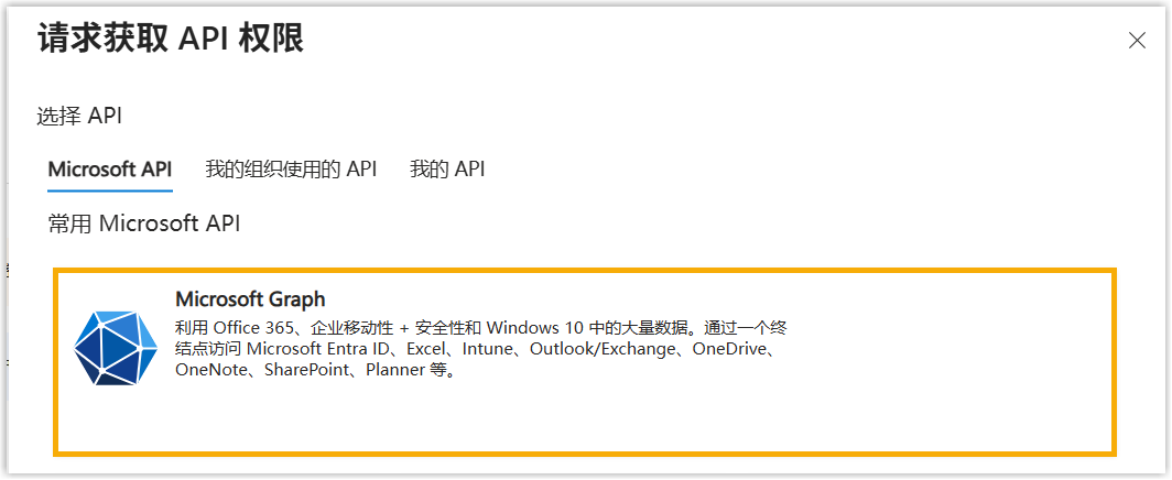 - 在 选择 API 页面,进入 Microsoft API > Microsoft Graph。