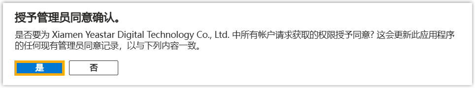 - 点击 授予管理员同意,同意向应用程序授予所需的权限。
