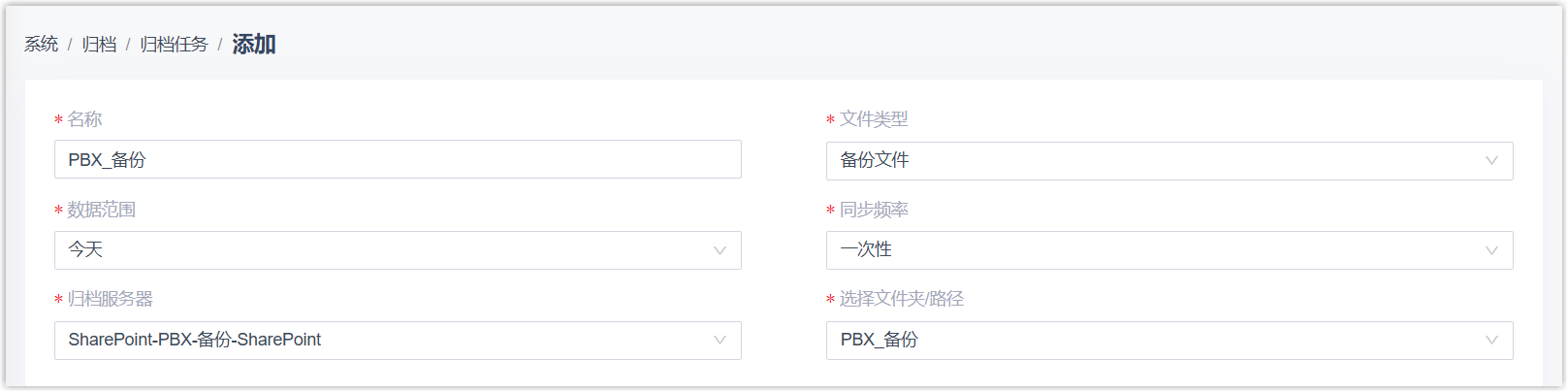设置 说明 名称 填写一个名称,帮助你识别此任务。 文件类型 选择 录音文件 或 备份文件。 数据范围 指定要归档的文件的时间范围。 注: 支持一次性归档最多 31 天内的数据。同步频率 设置文件归档到 Microsoft SharePoint 的频率。 注: 数据量过大会消耗 PBX 的 CPU,因此建议在空闲时间执行归档任务。- 一次性:保存归档任务后,系统立即归档文件。