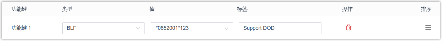 - 配置一个 BLF 键,用于展示指定去电显示号码是否被设置为分机的默认 DOD。注: 配置 BLF 按键前,需先获取 去电显示号码前缀 特征码 (路径:)。
