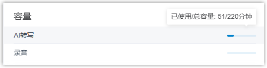 容量元件显示 AI 转写分钟数和录音分钟数的使用量和总容量。