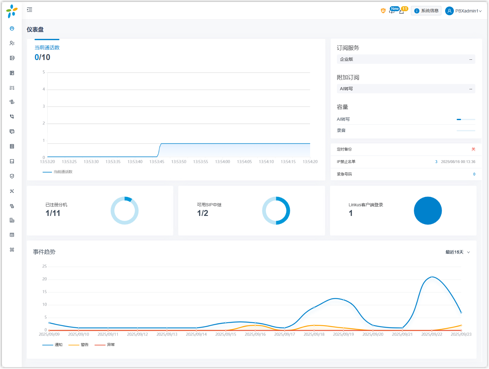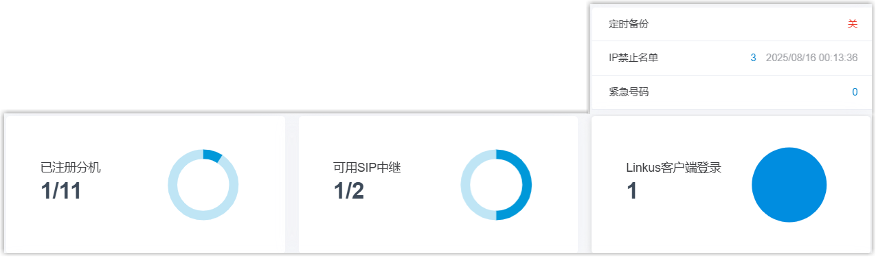 - 已注册分机:已注册的分机数和已创建的分机数。