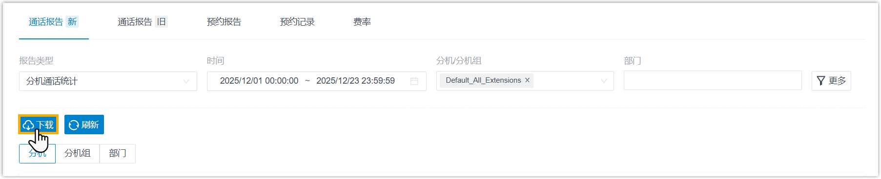 报告 筛选条件 分机 分机通话统计 - 分机/分机组