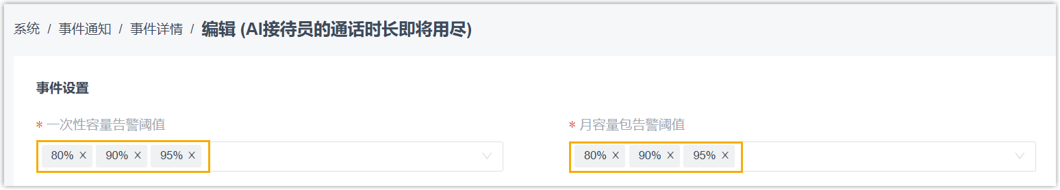 | AI接待员的通话时长即将用尽 | AI 接待员一次性容量或月容量包中分钟数的使用率 (已使用的分钟数 /
