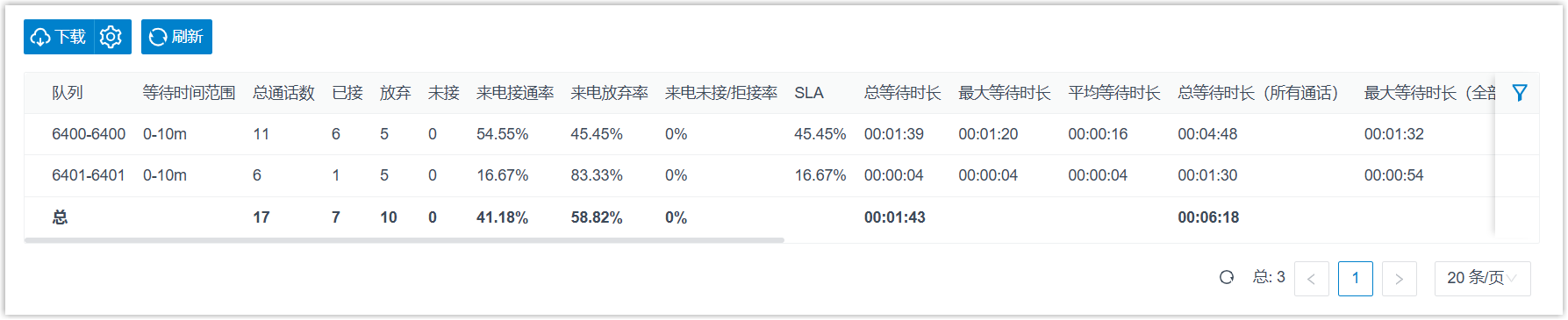 | 总等待时长 (所有通话) | 所有来电中,呼叫者在队列中的等待总时间。 |