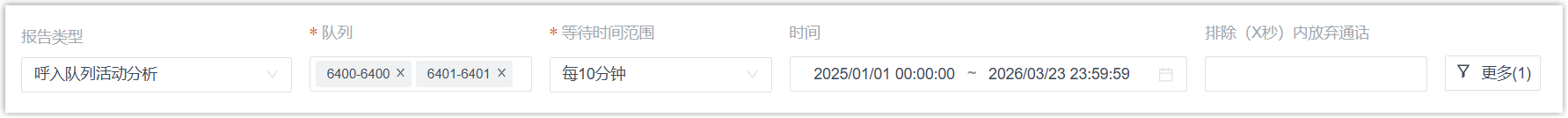 | 等待时间范围 | 统计呼叫者在接通坐席前的等待时长统计区间。 |
