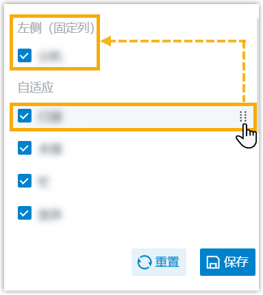 固定列 点击字段旁边的 ,将其拖拽到 左侧 (固定列)右侧 (固定列)