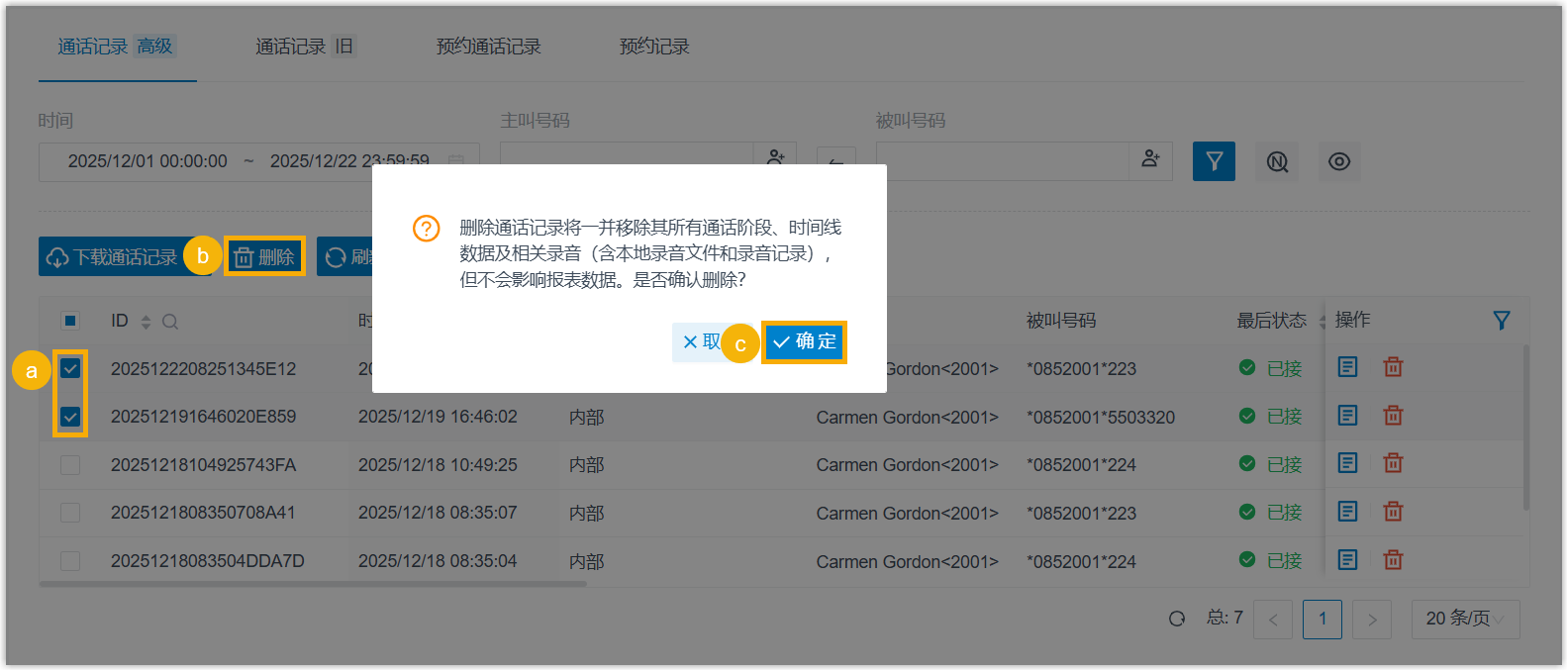 - 勾选通话记录,点击 删除 并确认操作。