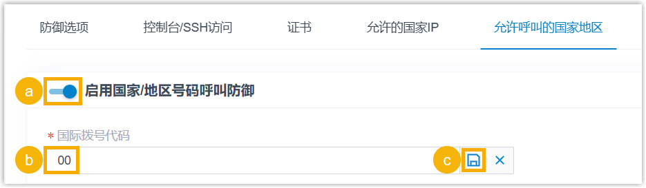 - 启用国家/地区号码呼叫防御,设置国际拨号代码。