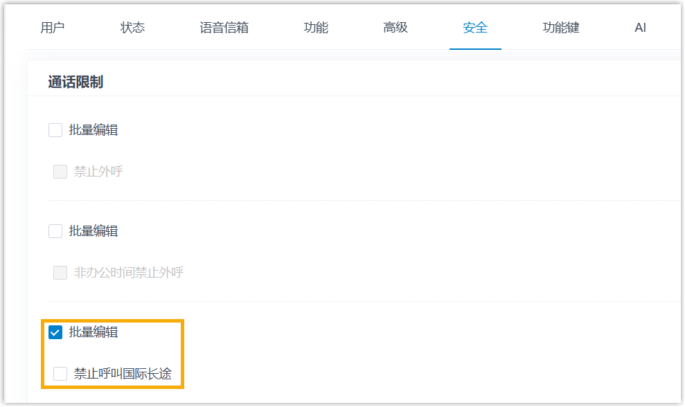 - 在 通话限制 栏,勾选 批量编辑,取消勾选
