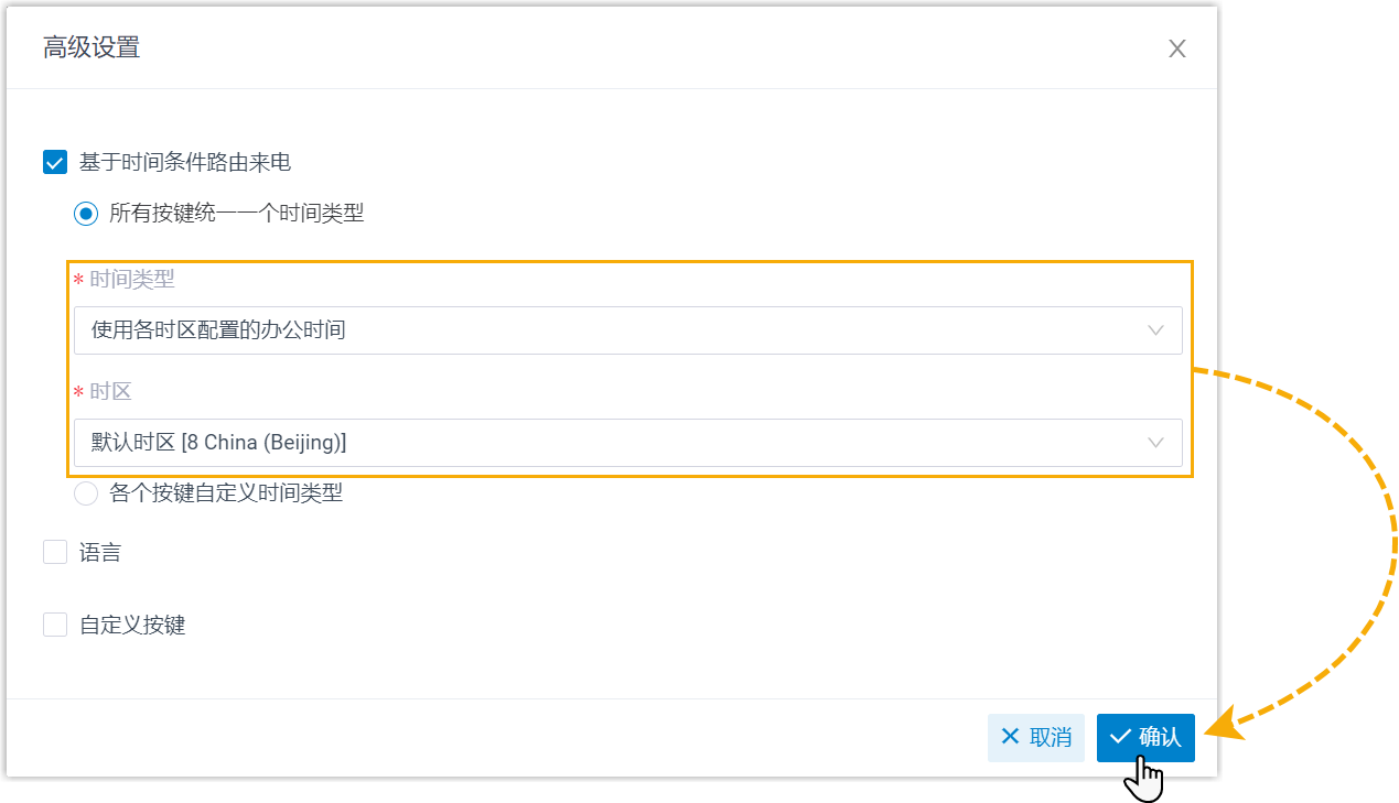- 在弹窗中,勾选 基于时间条件路由来电。