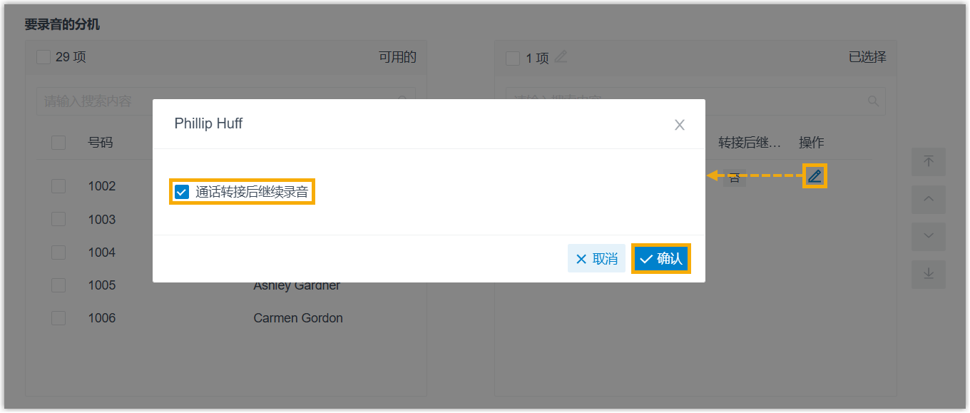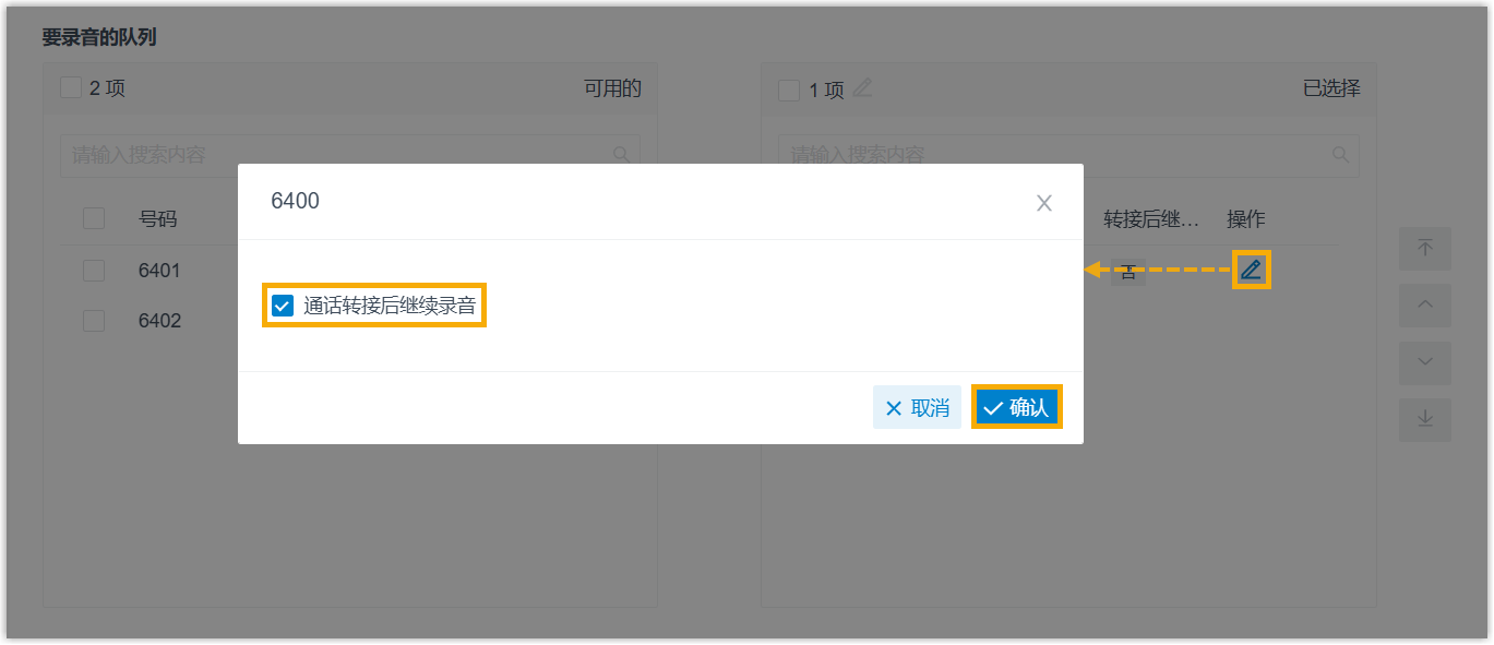 。 - 在弹出的窗口中,勾选 通话转接后继续录音,然后点击 确认。