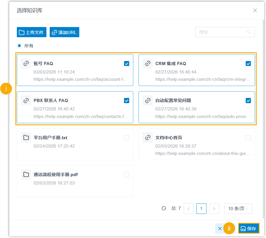 注: 如果找不到需要的知识库内容,可以直接点击 上传文件添加URL 进行添加,上传的内容将自动添加至全局知识库。