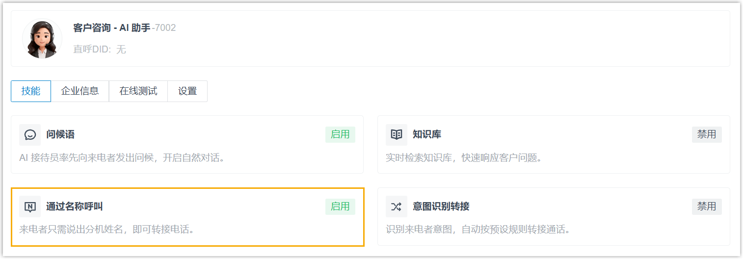 已为 AI 接待员启用了 通过名称呼叫 技能。当来电者说出分机名称时,AI 接待员将识别该名称并将通话转接至对应的分机。