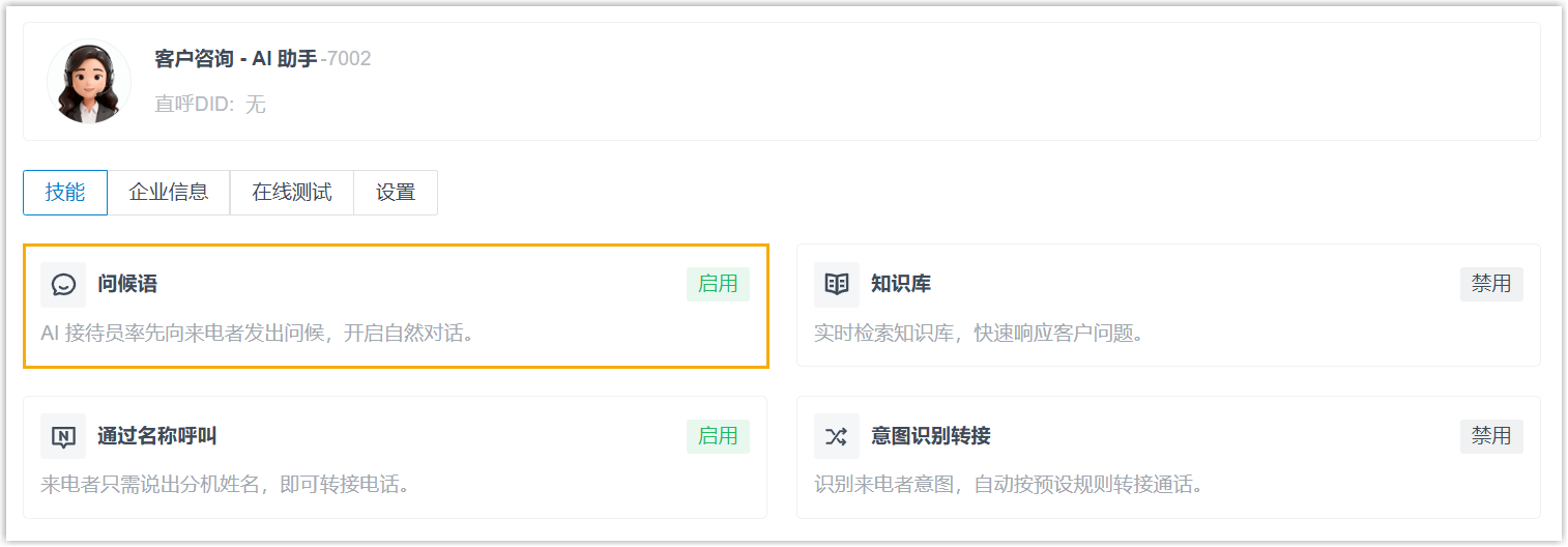 3. 技能 页签下,点击 问候语 技能卡片。