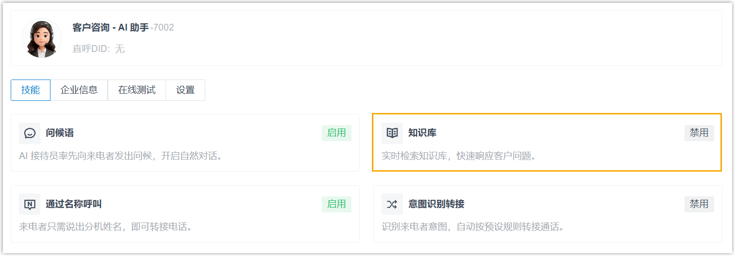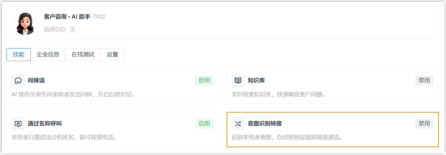 本文介绍如何为 AI 接待员配置不同的技能。