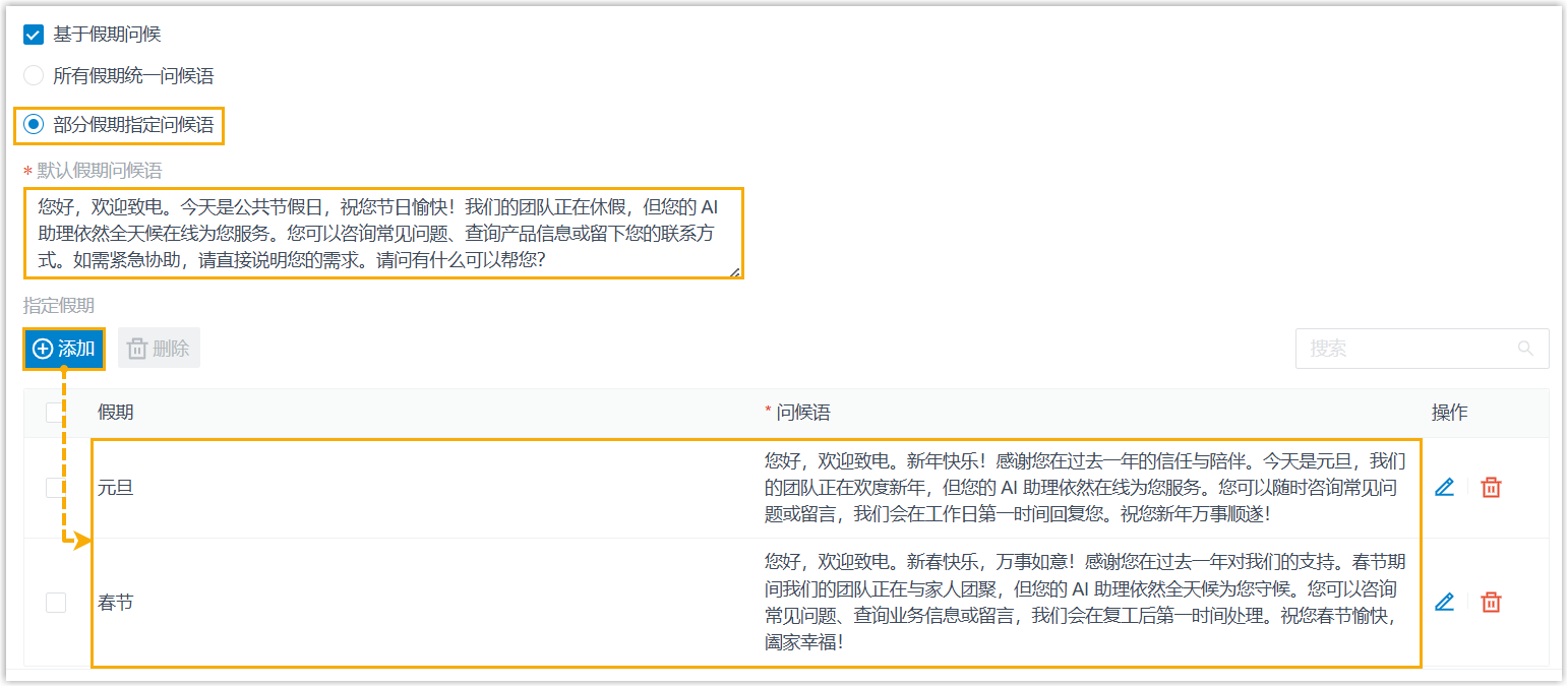 AI 接待员会在指定假期时接听的来电中播放对应设置的特定问候语;若未设置,则播放通用的假期问候语。