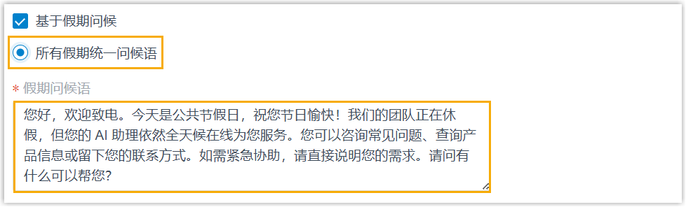 若选择此项,在假期问候语 字段中使用 AI 接待员的主要语言输入一个问候语。