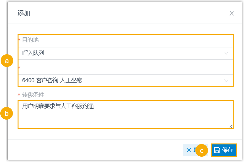 2. 转移条件 字段,用自然清晰的语言描述触发转接的场景。