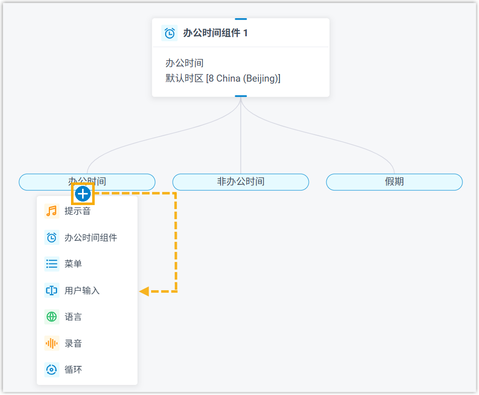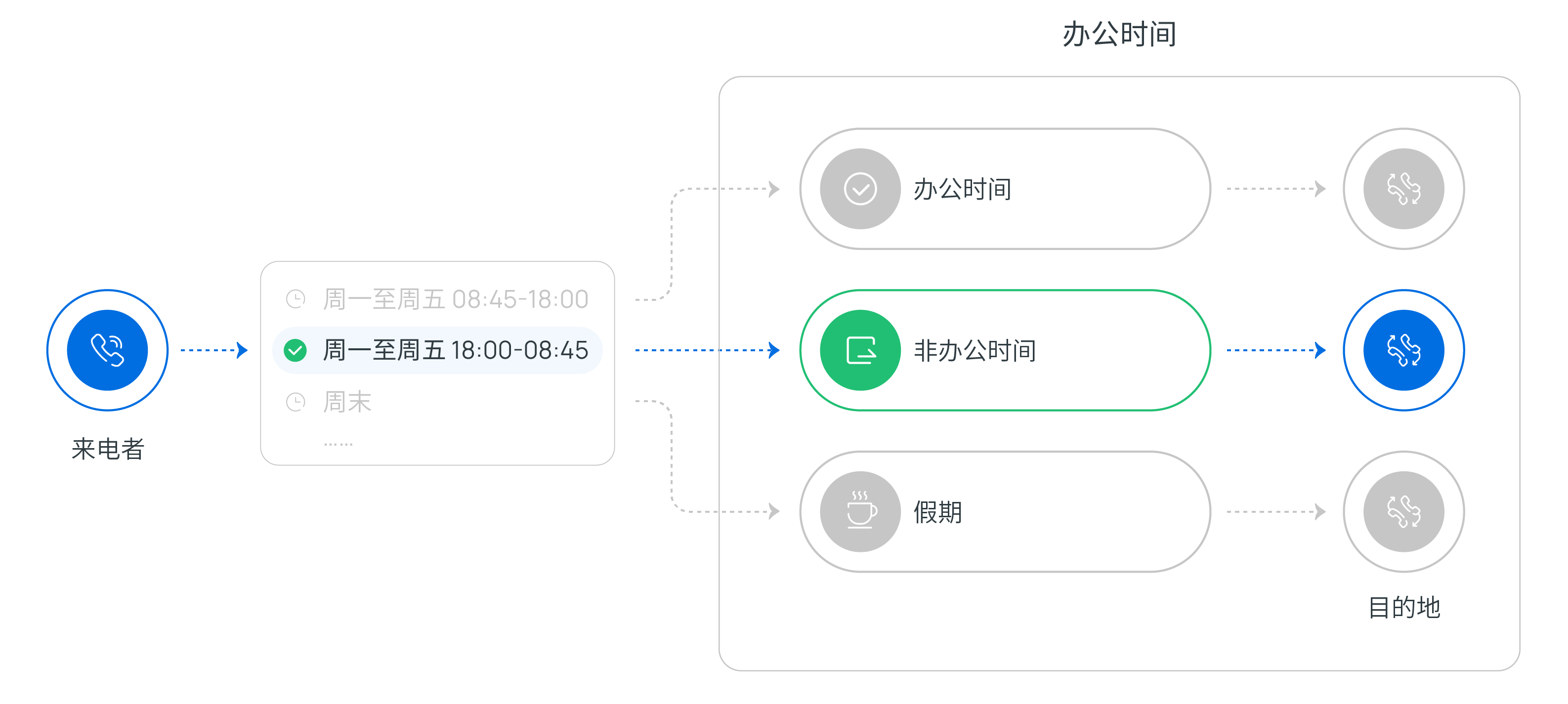 办公时间 组件支持根据不同时间将来电灵活路由至对应的目的地。系统提供多种时间类型,方便你自定义办公时间,并基于时间条件路由来电。
