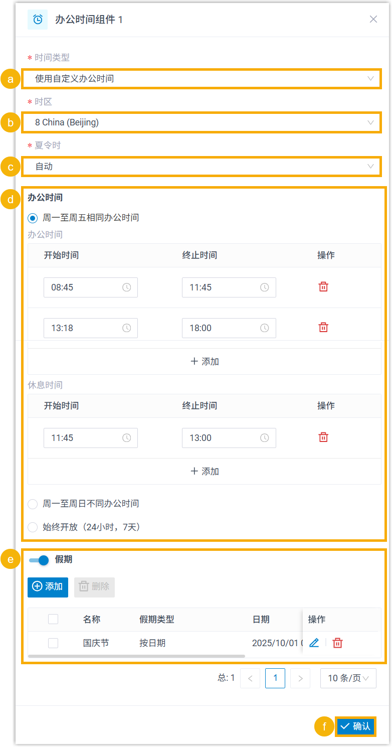 - 选择办公时间类型,并完成相关配置。注: 办公时间和休息时间各支持最多 10 个时间段。