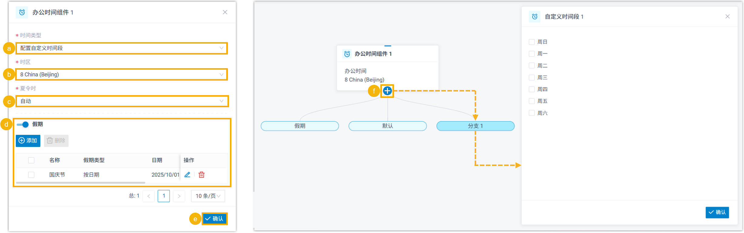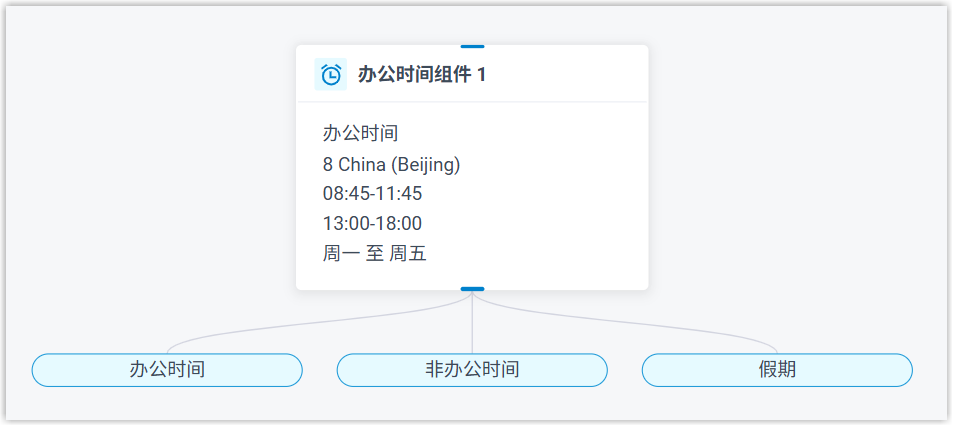 办公时间 组件默认包含多个时间分支 - 办公时间、非办公时间、假期 等。