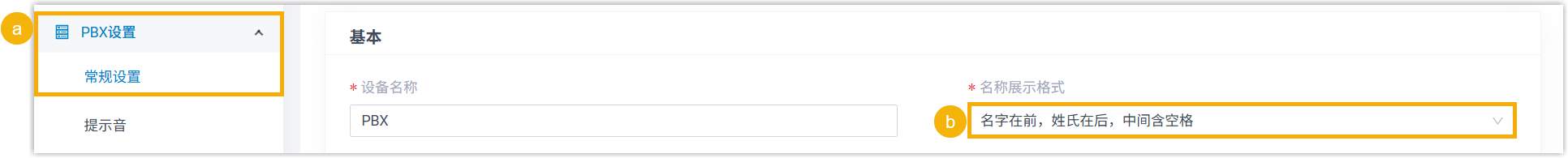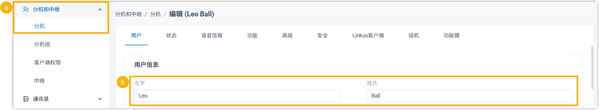 • 如需支持按名字搜索分机用户,选择 名字在前,姓氏在后,中间含空格