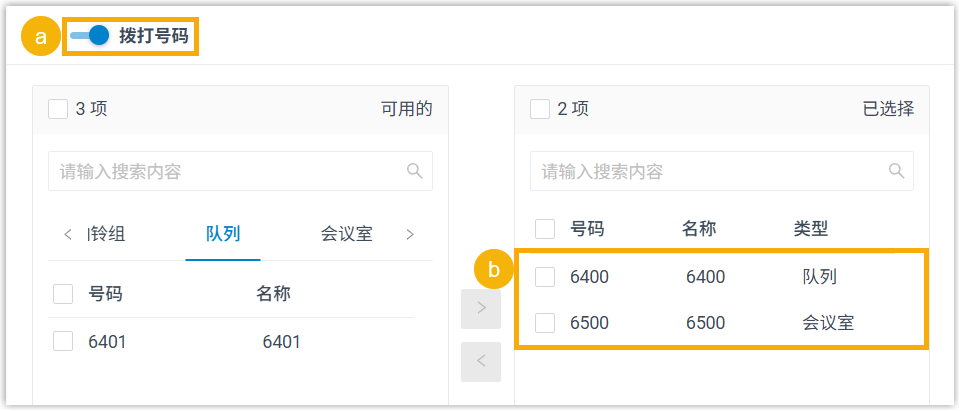 2. 将允许的号码从 可用的 框添加到 已选择 框。