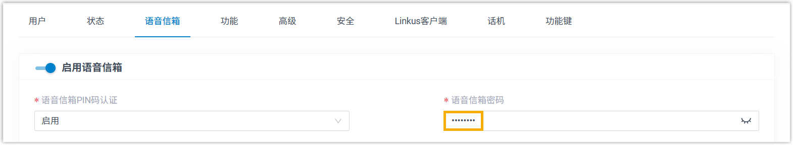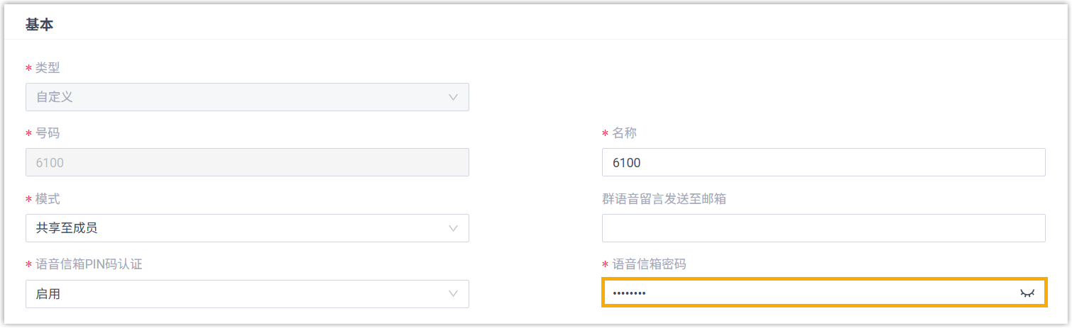 • 分机语音信箱密码:如需修改密码,进入 分机和中继 > 分机 > 语音信箱 > 语音信箱密码