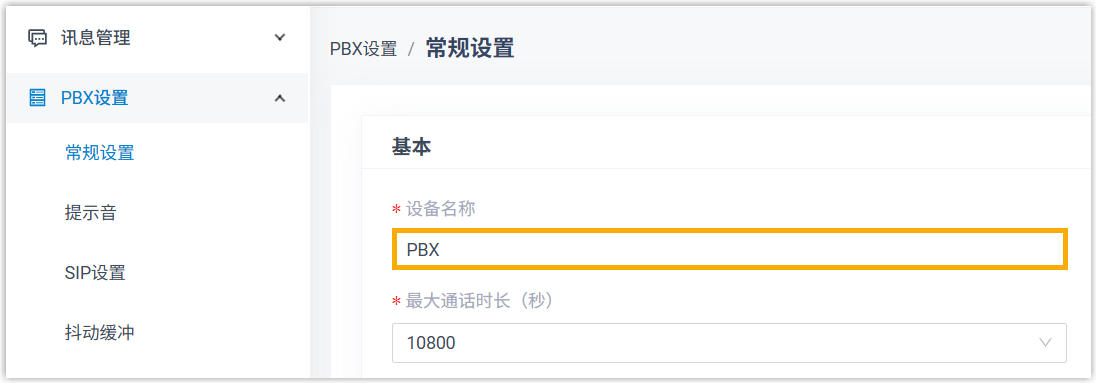 注: 你可以在 PBX 设置 > 常规设置 > 设备名称 中更改默认值。