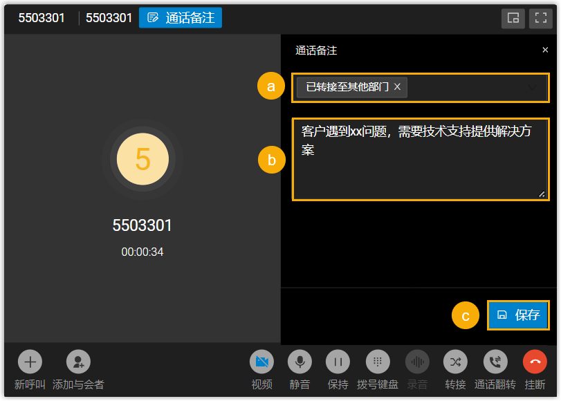 - 点击 保存。页面提示 “编辑成功”,表示已成功添加了通话备注。注: 在通话结束前你可以多次编辑通话备注。