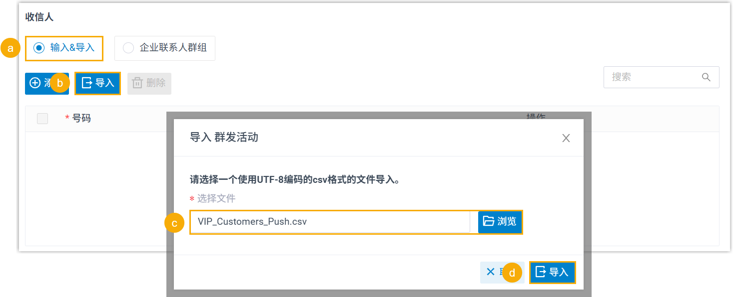CSV 文件导入 导入包含联系人号码的CSV文件。