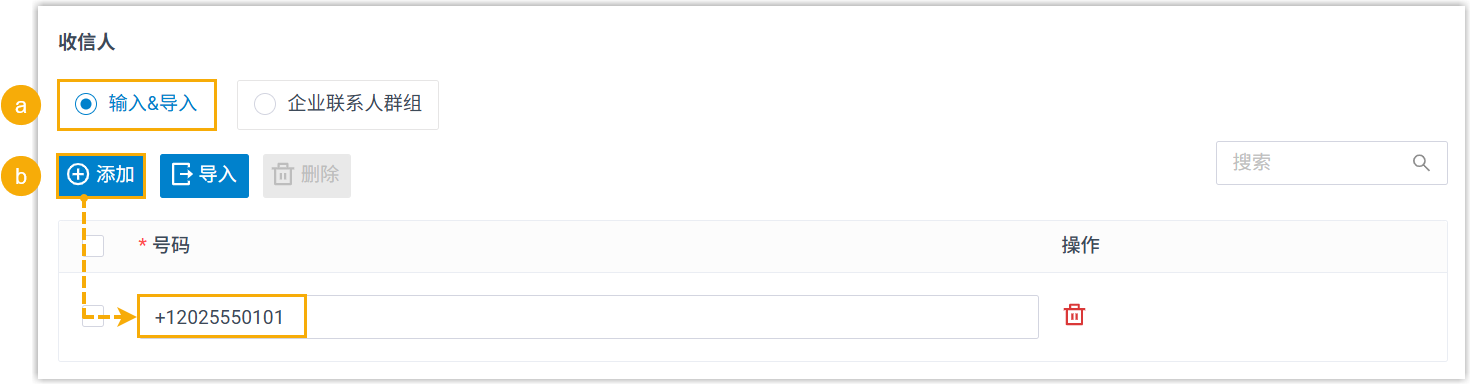 方式 操作介绍 手动输入 手动添加 E.164 格式的联系人号码 (例如: