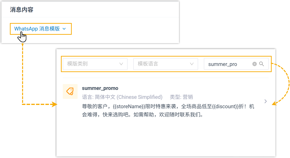 - 点击 WhatsApp 消息模版 ,搜索并选择所需的消息模板。