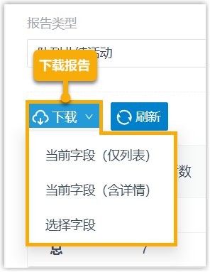 - 选择字段:自定义报告中要包含的字段,然后按需下载列表数据,或同时下载列表数据和队列通话详情。