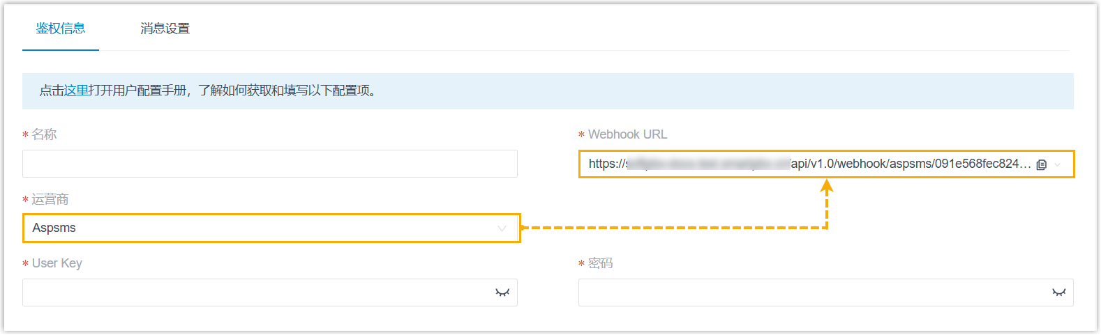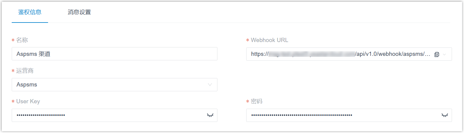 - 在 鉴权信息 栏,填写 Aspsms 的鉴权信息。