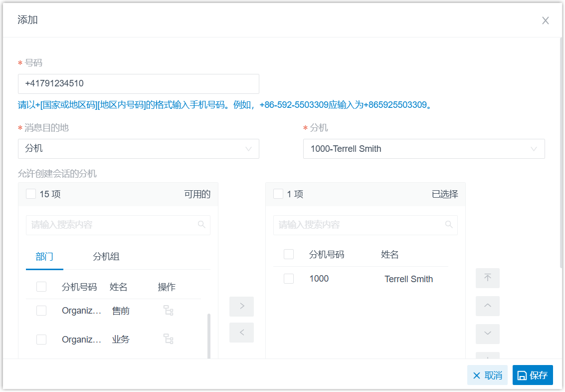 - 号码:填写购买的号码。注: 需以 E.164 格式填写 (