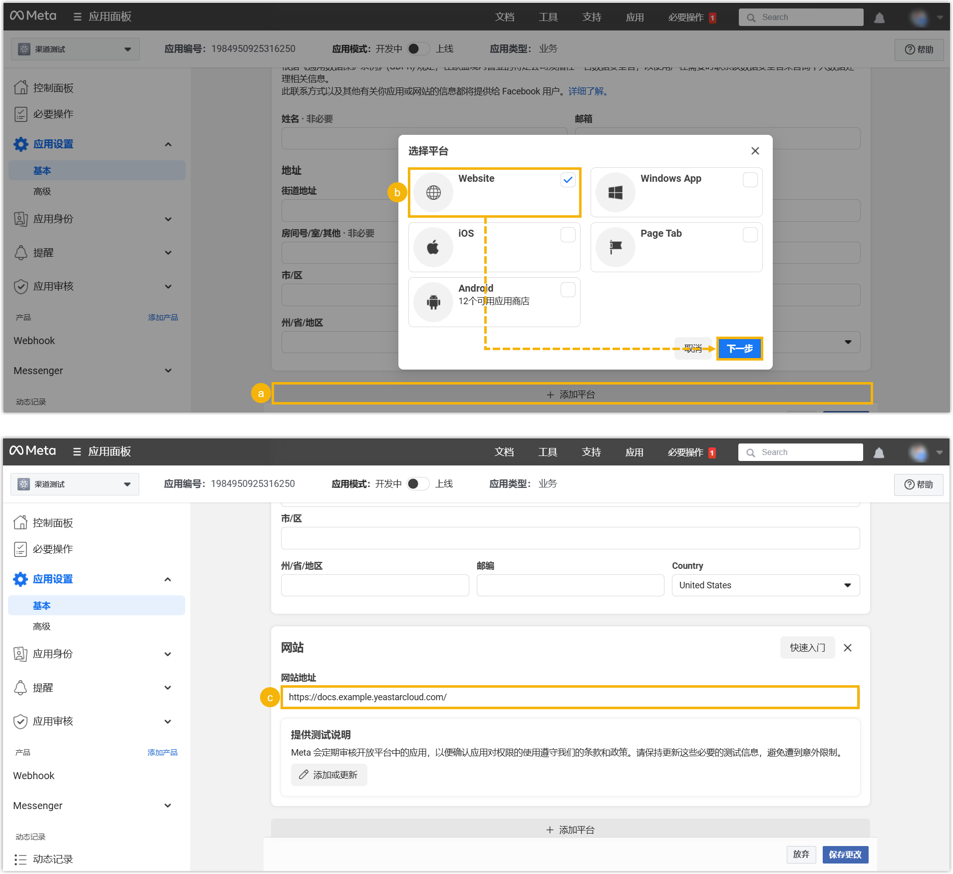 - 滚动到页面底部,添加网站平台以共享 PBX URL 给 Meta。