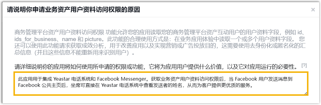 此应用用于集成 Yeastar 电话系统和 Facebook Messenger。获取业务资产用户资料访问权限后,当 Facebook 用户发送消息到 Facebook 公共主页后,坐席可直接在 Yeastar 电话系统中查看发送者的姓名,从而为客户提供更优质的服务。